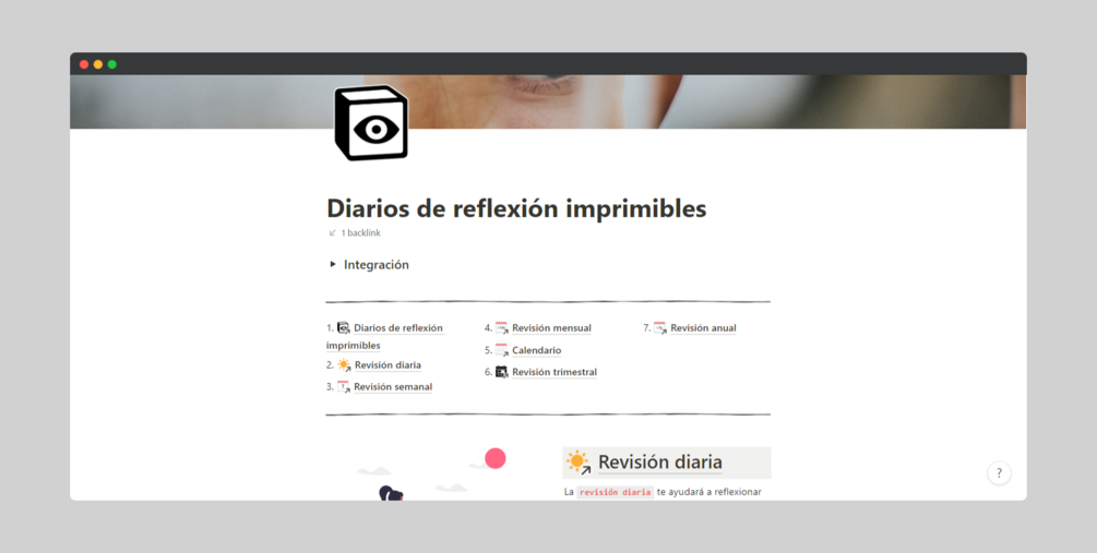 • Revisa tus semanas y reflexiona sobre el mes para saber si estás alineado con tus objetivos con la plantilla imprimible "Revisión mensual". Incluye 6 preguntas reflexivas, 3 cosas que debes dejar/empezar/continuar haciendo, y una valoración del mes.