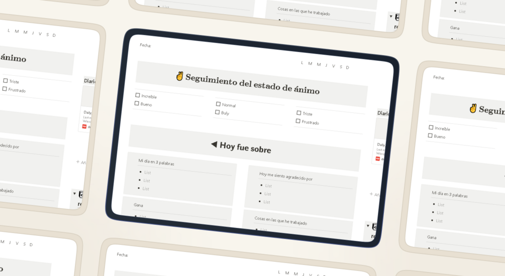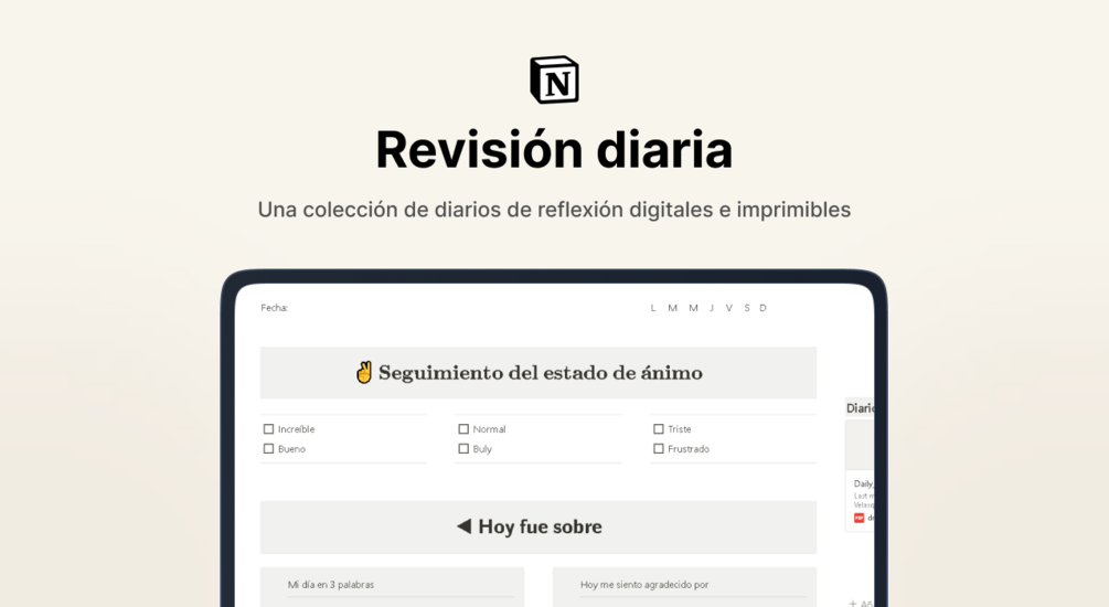 Conozca el rendimiento global diario con la plantilla imprimible "Revisión diaria". Incluye un rastreador de estados de ánimo y 6 preguntas de reflexión.